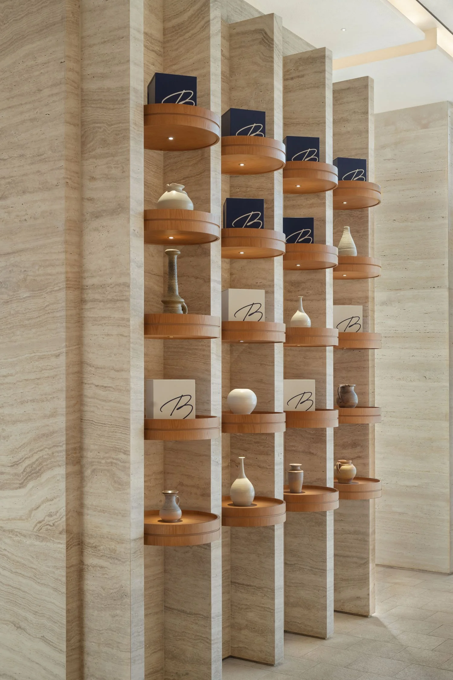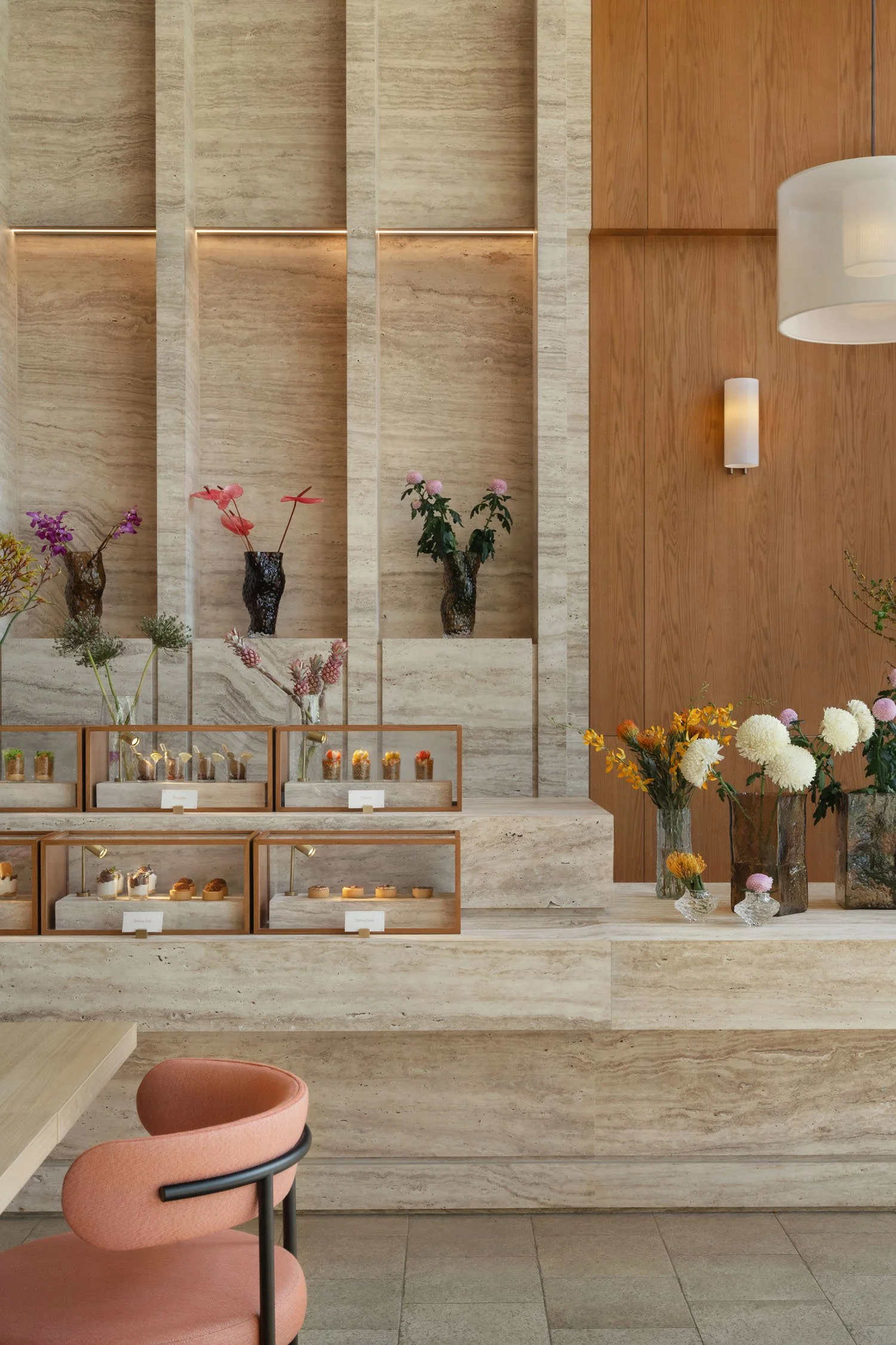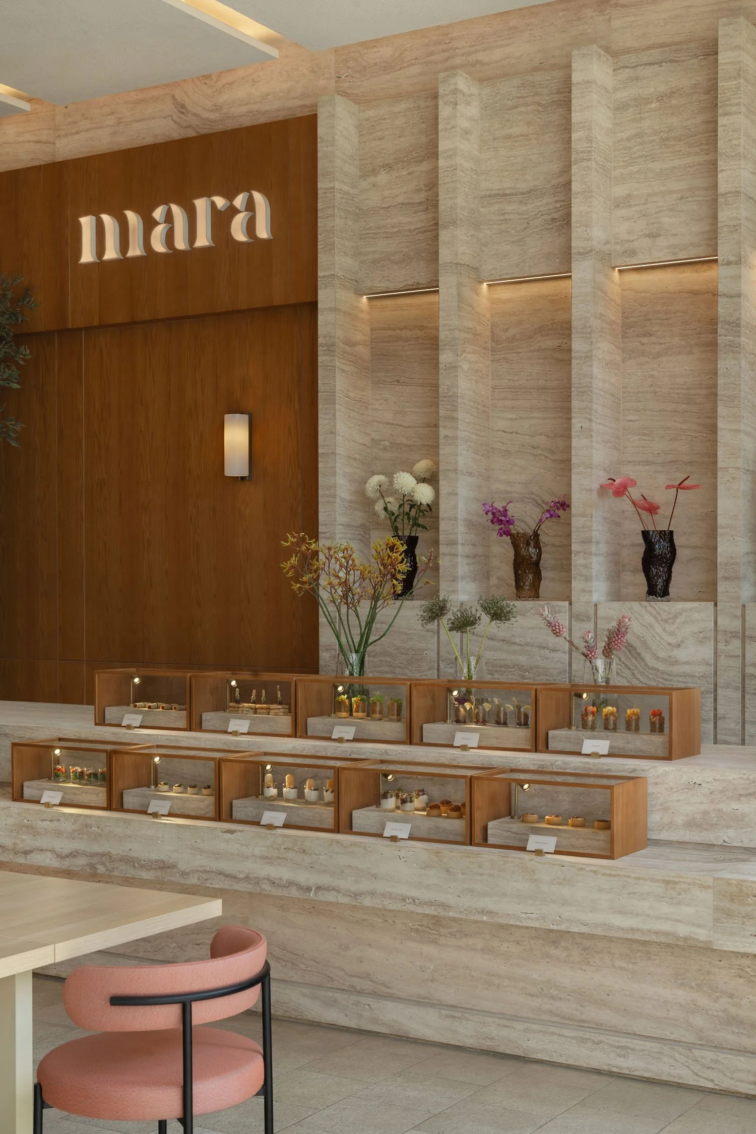 While maintaining to preserve the inherent simplicity of the brand, we came up with a fusion of warm walnut wood and elegant travertine setting the stage for a truly inviting design and atmosphere. Forming a symphony of textures and aesthetics, where every detail tells a story of craftsmanship and charm.