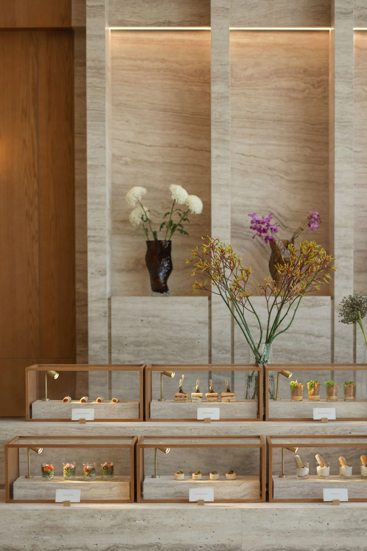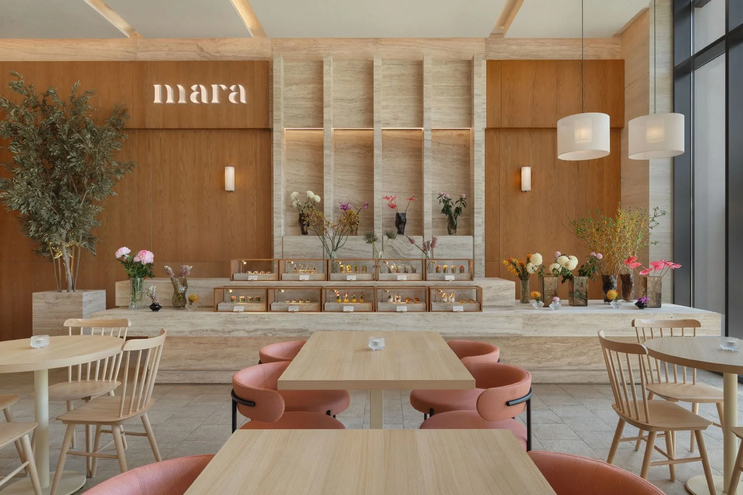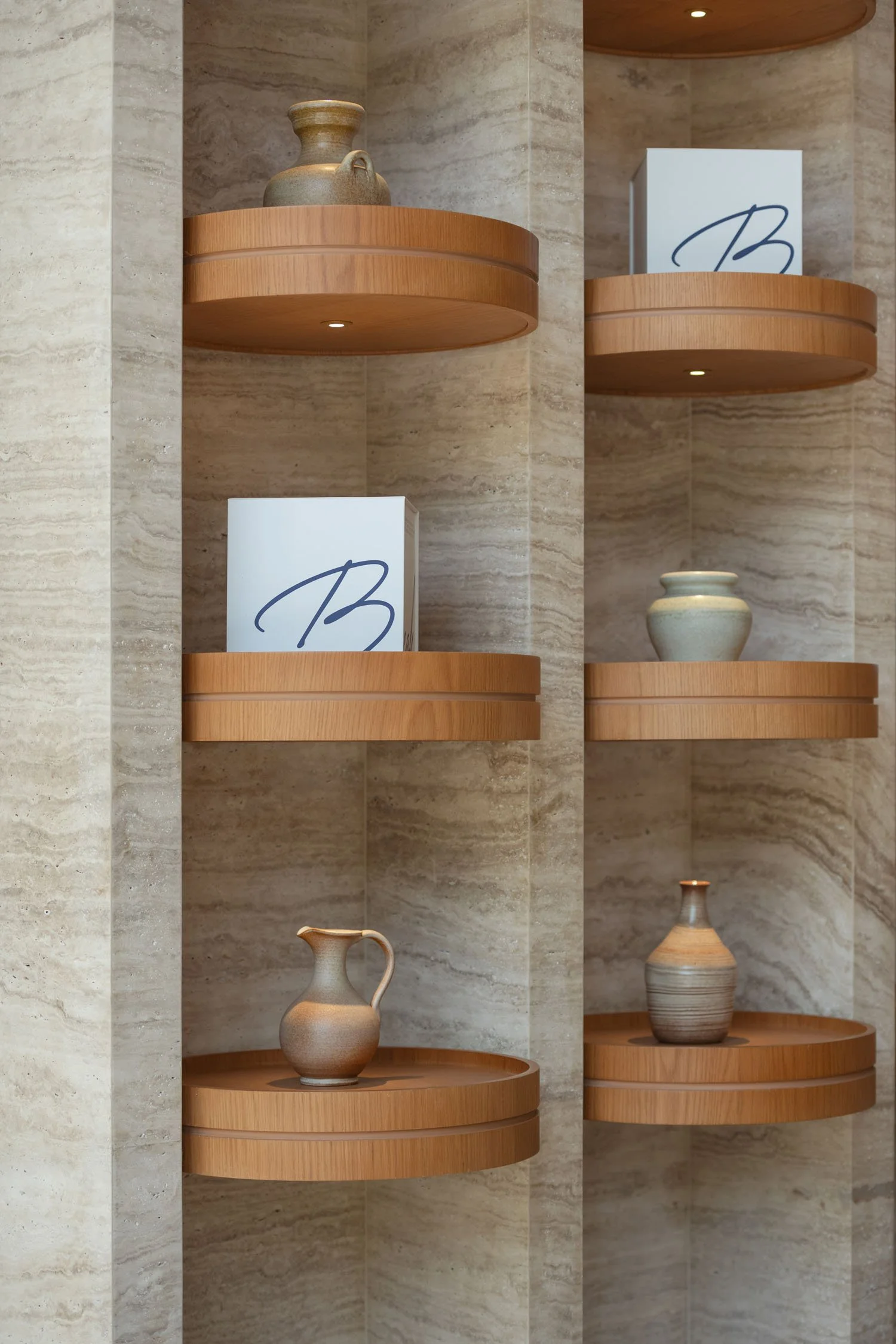 While maintaining to preserve the inherent simplicity of the brand, we came up with a fusion of warm walnut wood and elegant travertine setting the stage for a truly inviting design and atmosphere. Forming a symphony of textures and aesthetics, where every detail tells a story of craftsmanship and charm.